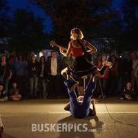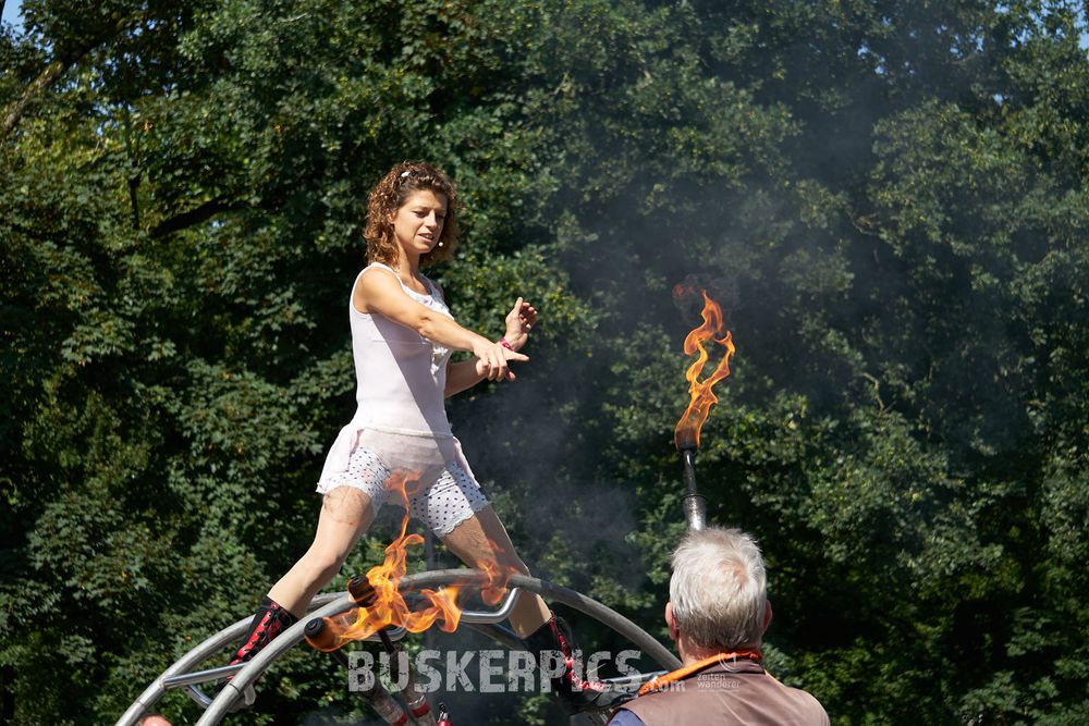 Duo Circo Puntino aus Italien präsentiert die „Gregor & Katjusha’s Great Circus Show“. Dass die beiden Artisten nur als Duo auftreten fällt durch ihr German Wheel (Rhönrad) und dem „3-wheeled-giraffe“-Einrad kaum auf. Bei ihrer Show erleben die Besucher den Zauber eines gesamten Zirkusses. Wenn Gregor sein dreirädriges Einrad fährt bleibt den Zuschauerinnen und Zuschauern schon mal der Atem stehen. Gepaart mit der Faszination von Katjusha Kunststücken im und auf dem Rhönrad ergibt sich eine unterhaltsame, poetische und surreale Straßenshow mit brennendem Finale.